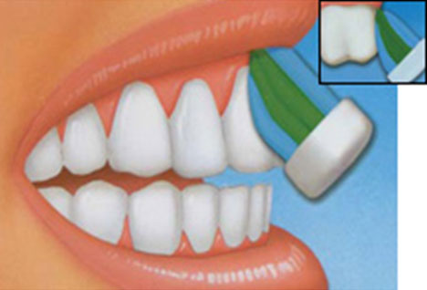 • Puis, dans un mouvement de rotation de la brosse sur elle même, masser légèrement de la gencive vers les dent