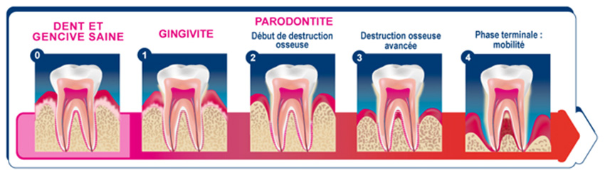 L’infection et l’inflammation progressent au niveau des tissus de soutien des dents, entrainant leurs dégradations irréversibles, pouvant à terme provoquer la perte des dents. Les symptômes sont :